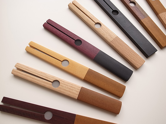 「爪研ぎヤスリ」このヤスリは4代続いた専門職人の仕事だ。よく切れて美しい。これに相応しい鞘を作りたいと思った。28種類の木材で100本の組み合わせを作った。 gallery5610-deska.jp-minami aoyama