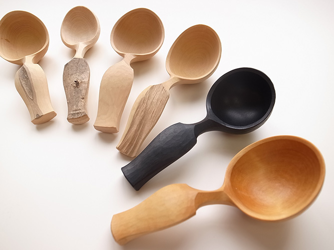 本展では、コーヒーの豆をすくう木製匙、爪研ぎヤスリ、くり物の器、