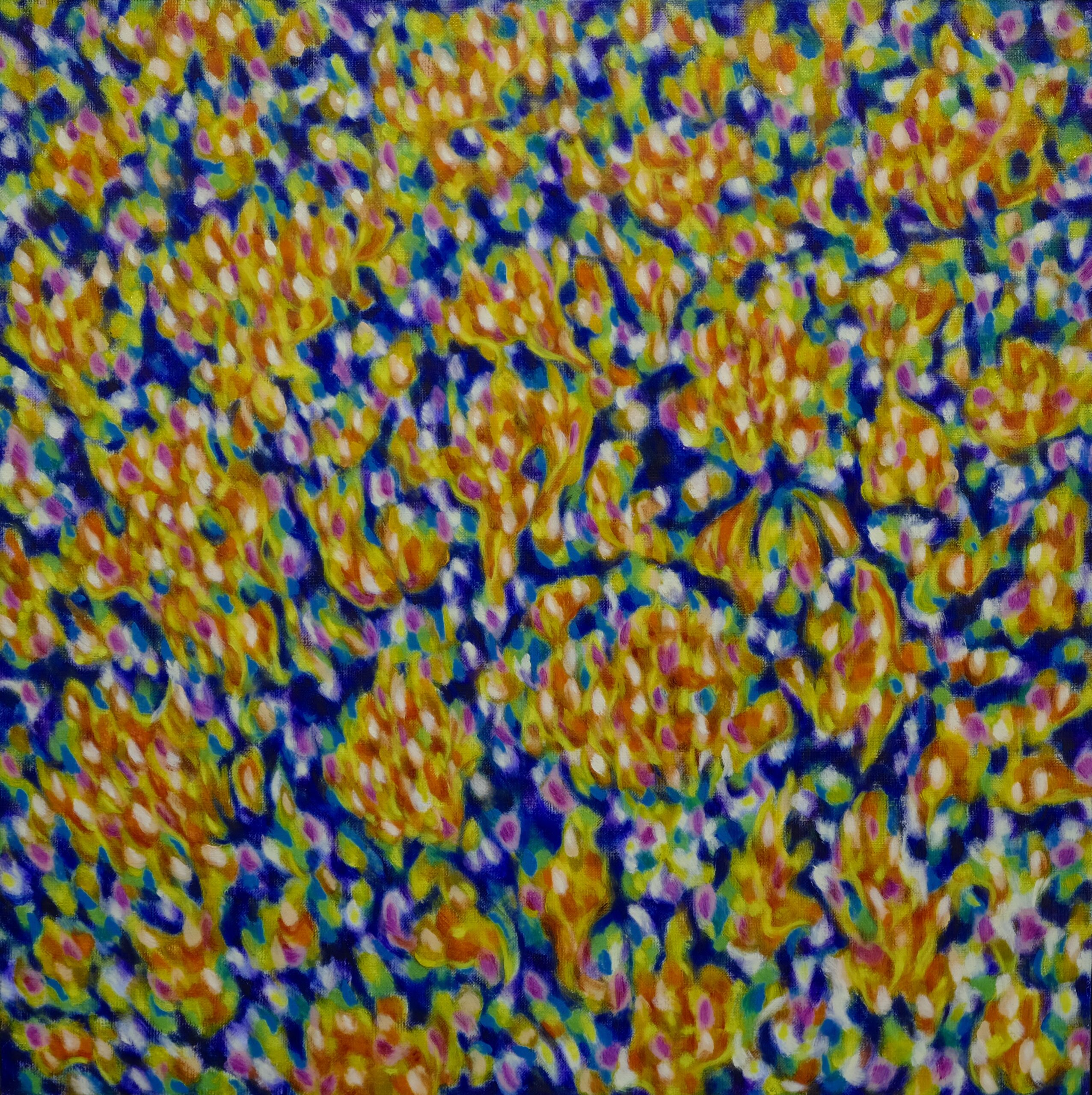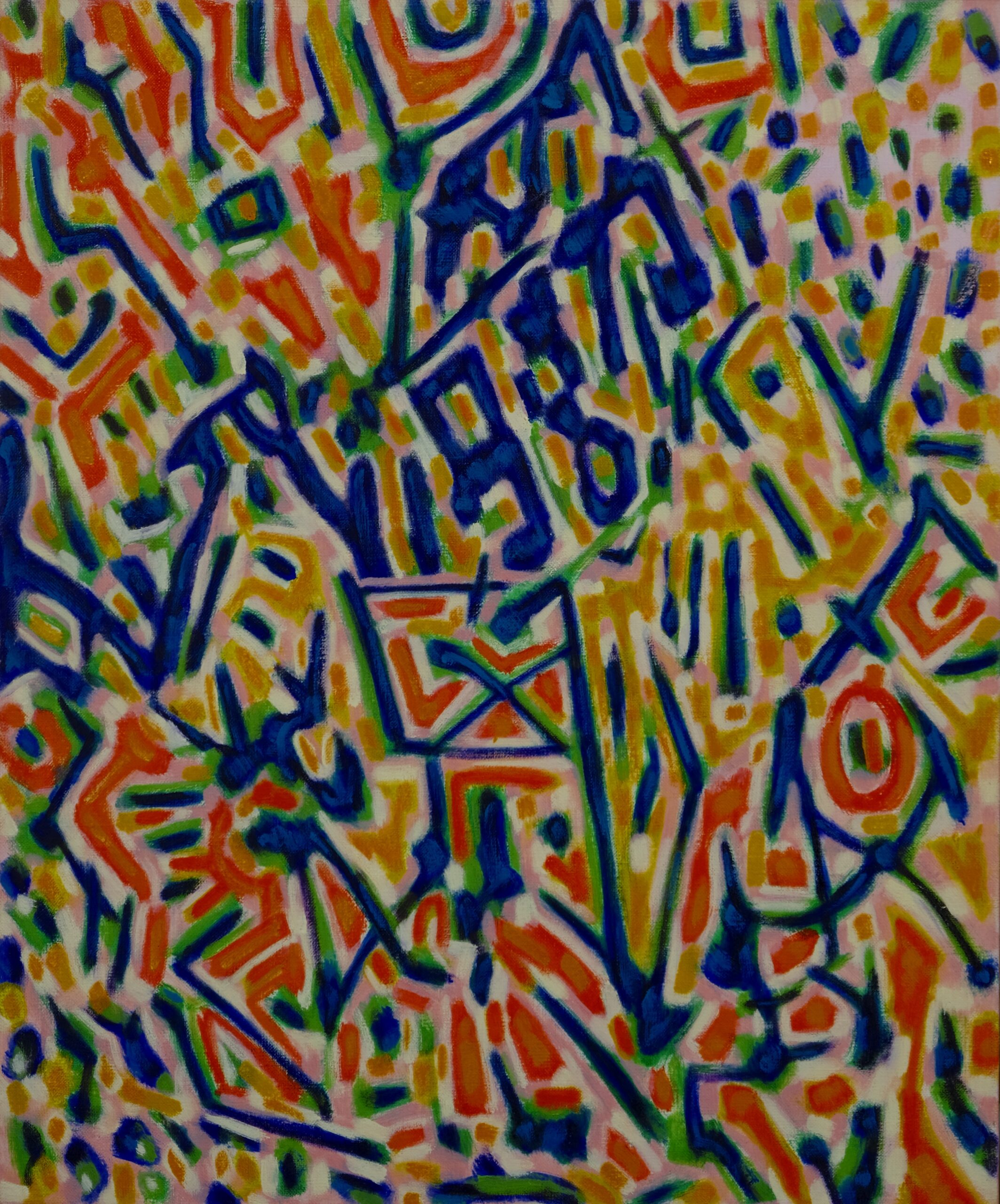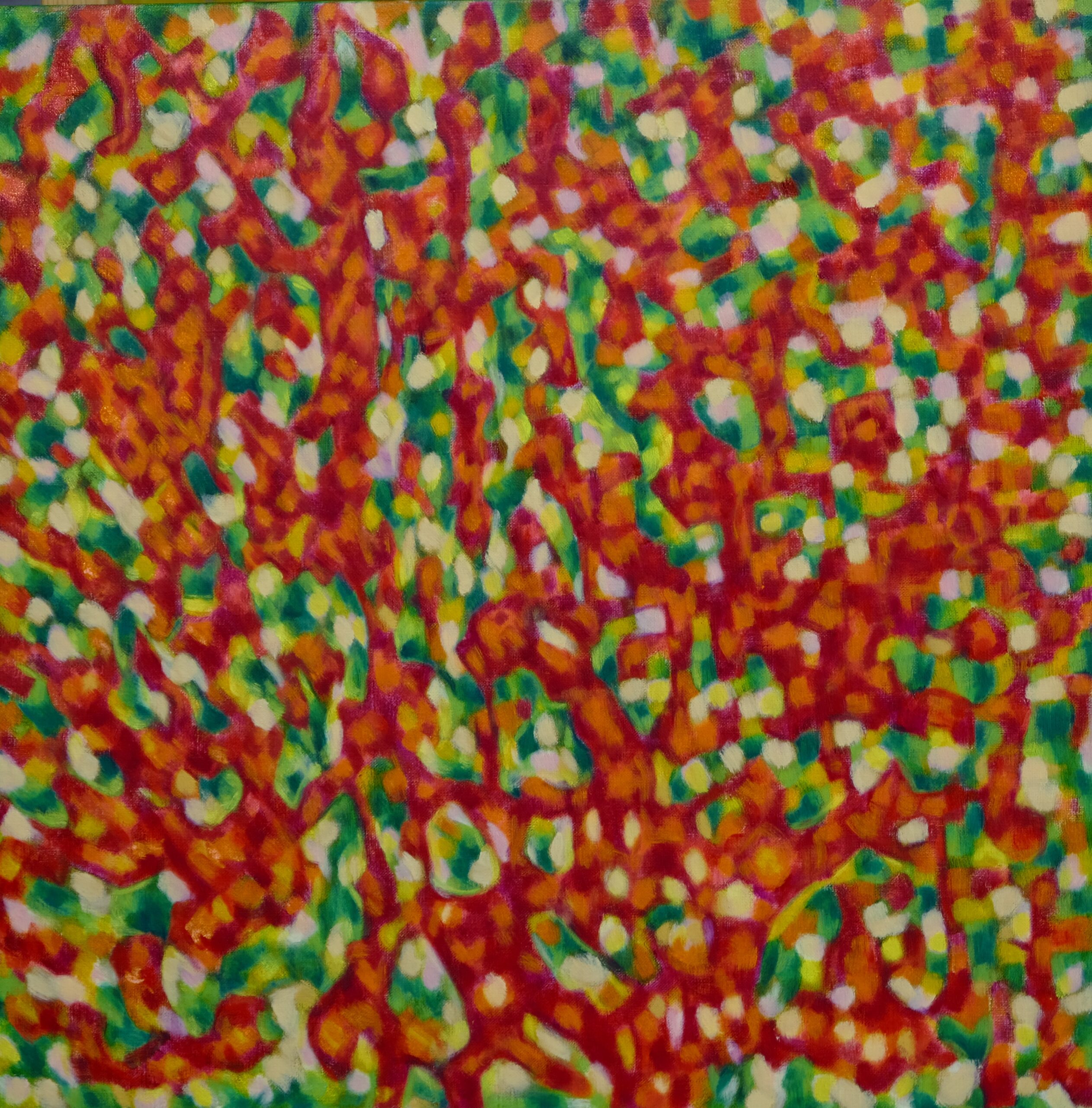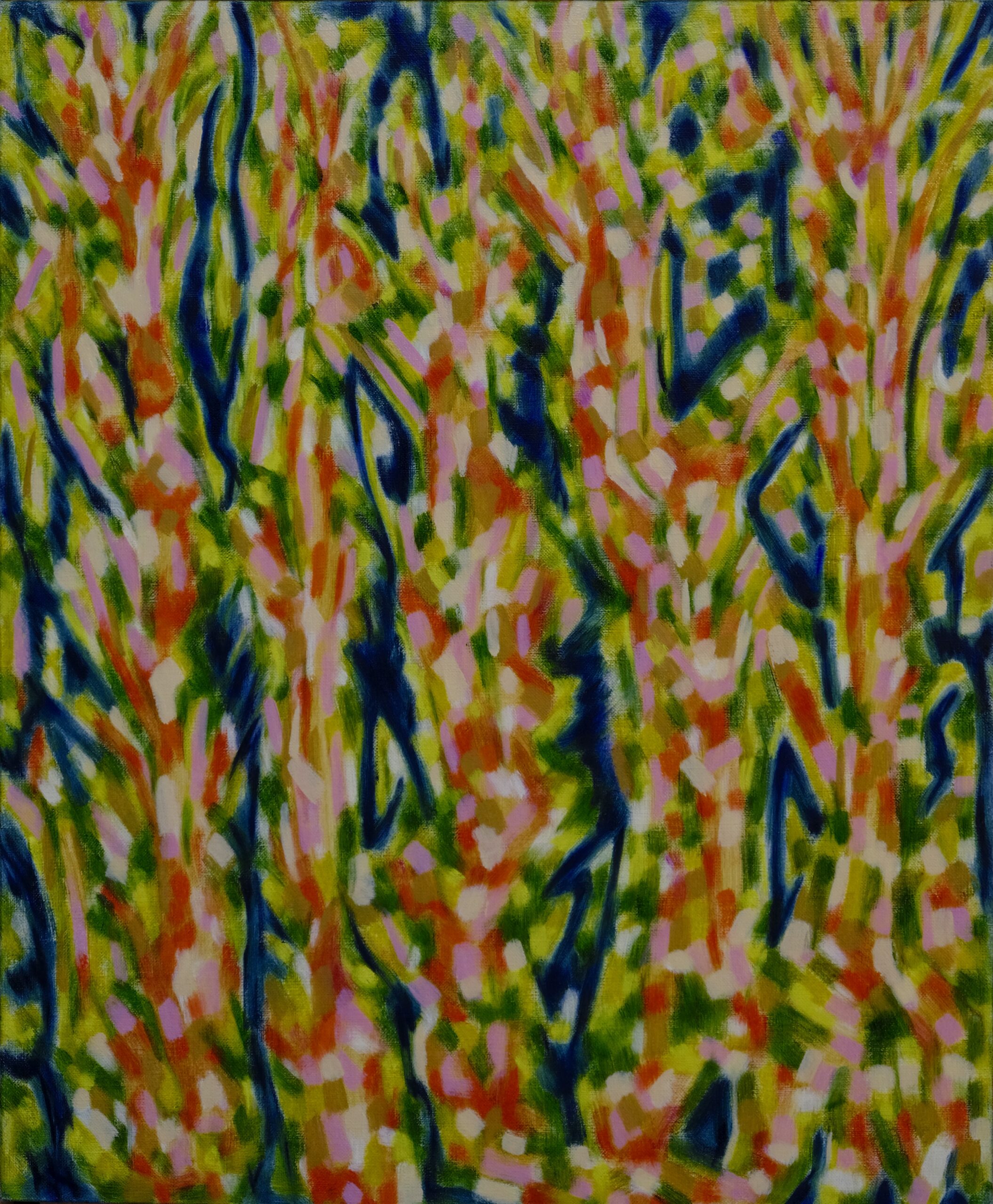 相変わらずキャンバスに向かい時間をかけて絵具を塗り重ねていく。 アタマの中はコトバの洪水だが、そのおしゃべりを聞いている訳にもいかない。答えをコトバの中に探してみてもうまくはいかず、次の一手をさぐる。外れることもあるが当たることも多い、いや当たるまでやるのだ。色を選んだら次は筆で塗るという作業だ。筆跡(ふであと)が進路を決していき、顔料の作り出す糊塗面が躍動する生(せい)の感覚を産みだす。
